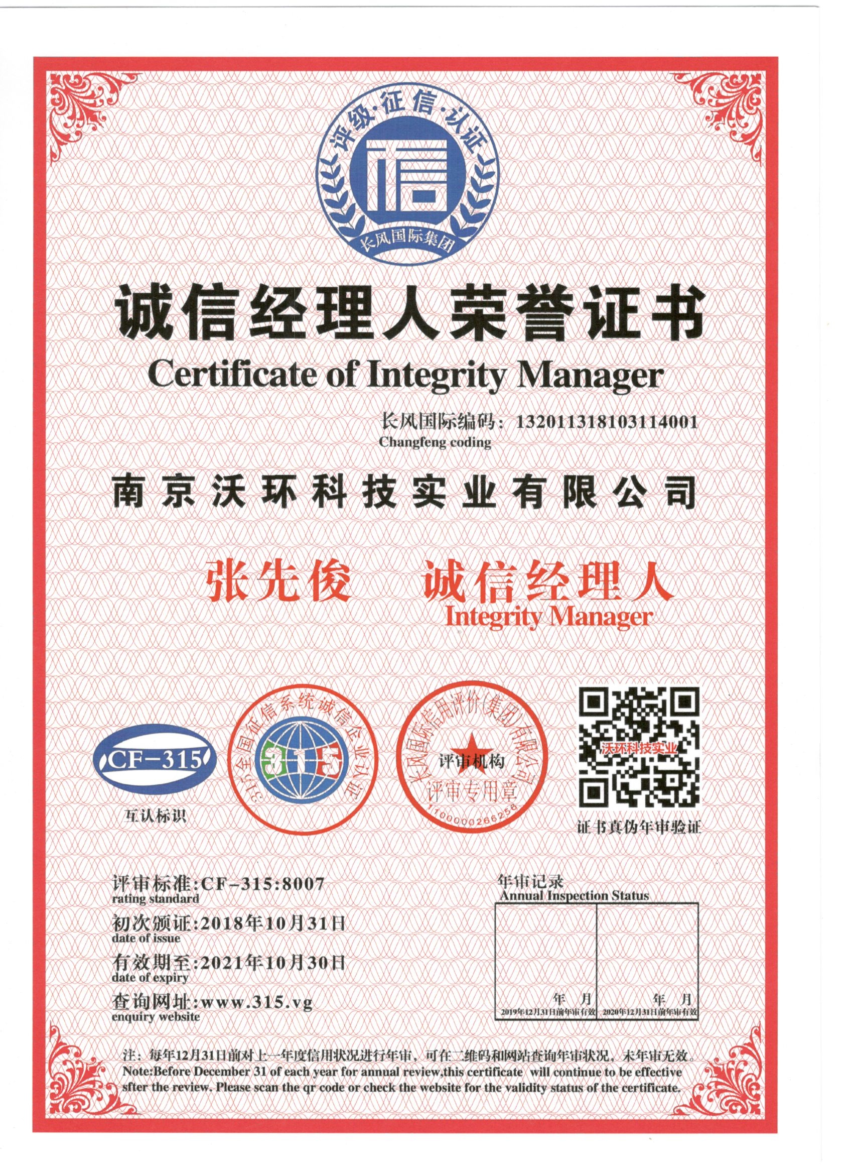 熱烈祝賀南京沃環(huán)公司張先俊先生被專業(yè)評審機(jī)構(gòu)-長風(fēng)國際集團(tuán)評為誠信經(jīng)理人,特發(fā)此證書